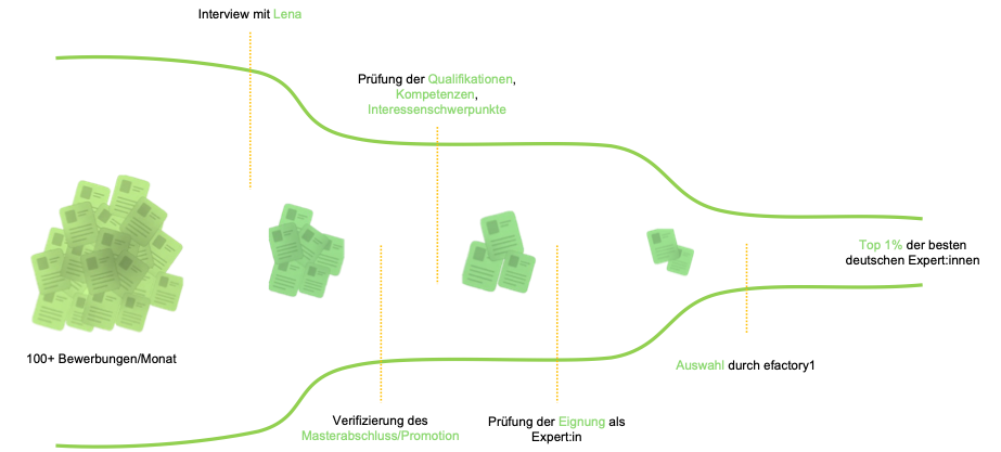 Bei efactory1 setzen wir auf höchste Fachkompetenz, Integrität und Authentizität. Deshalb arbeiten wir ausschließlich mit deutschen Muttersprachler:innen, die mindestens einen Masterabschluss vorweisen können. Jeder Bewerber durchläuft bei uns einen strengen, vierstufigen Auswahlprozess: